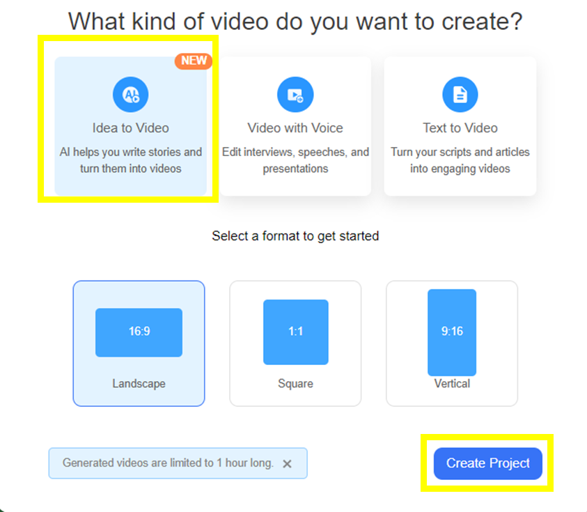 3. 세 가지 옵션 중 Ideo to Video 선택 후 Create Project 클릭
