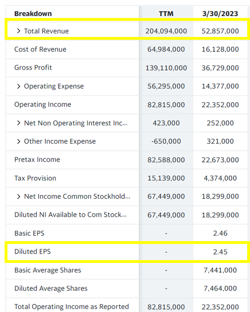 아래는 야후 파이낸스 데이터입니다. 챗GPT가 언급한 매출액($52.9B), 주당 순이익($2.45B)이 야후 파이낸스 데이터와 일치합니다.