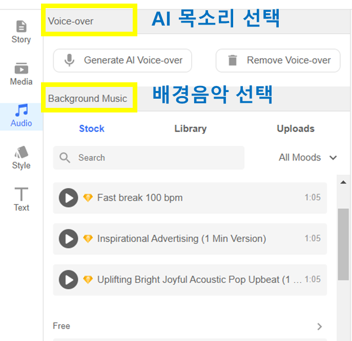 9. Audio에서 AI의 목소리와 영상 배경음악을 선택합니다.