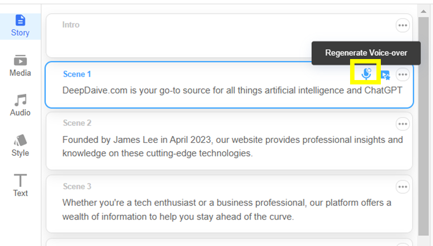 좌측에 Story, Media, Audio, Style, Text 총 5가지 옵션이 있습니다. 각 옵션의 역할은 아래와 같습니다.