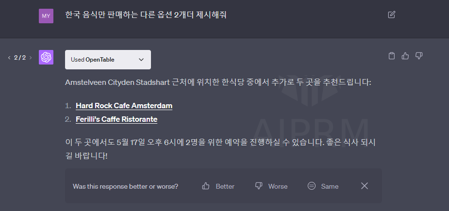 해외에서 한국인이 운영하지 않는 한식당은 한국인이 일반적으로 생각하는 맛과 굉장히 다른 경우가 많습니다. 그래서 다시 한국 음식만 판매하는 다른 옵션을 2개 제시해달라고 요청했습니다만, 이번에는 한국 음식과 아무런 관련이 없는 답변을 제공합니다.