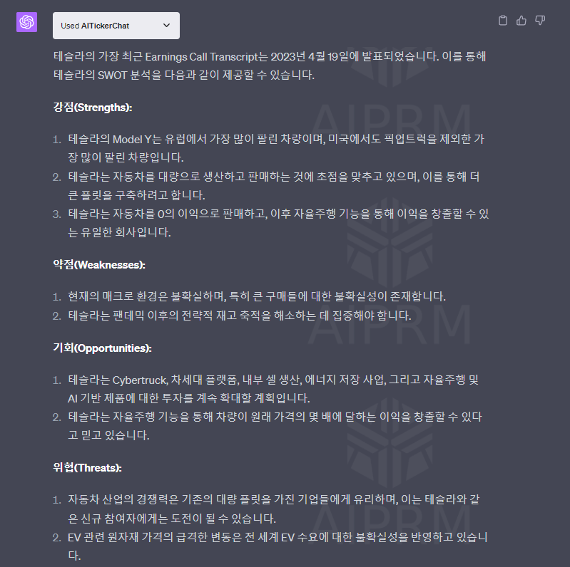 단순히 수치로 된 실적 정보만 제공하는 것이 아닌, 질문자가 궁금한 내용에 대해서도 답변해 줍니다. 심지어 SWOT까지 분석해 주니 해외주식 투자자라면 매우 유용하게 사용할 수 있는 툴이라고 생각됩니다.