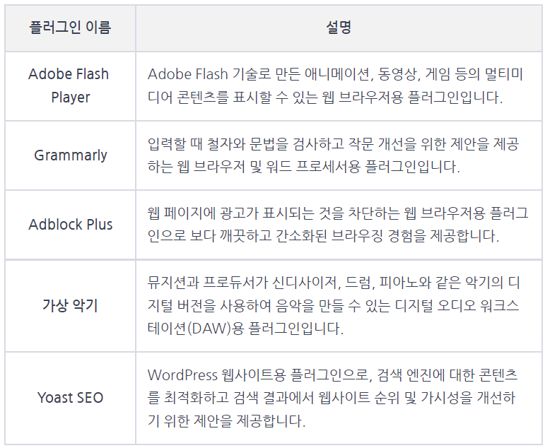 플러그인은 웹 브라우저, 콘텐츠 관리 시스템, 이미지 편집기 및 기타 여러 유형의 소프트웨어의 기능을 확장하는 데 사용할 수 있습니다. 예를 들어, 웹 브라우저 플러그인은 사용자가 브라우저 창에서 바로 동영상이나 대화형 애플리케이션과 같은 특정 유형의 멀티미디어 콘텐츠를 볼 수 있게 해줍니다. 콘텐츠 관리 시스템용 플러그인은 SEO 최적화 또는 소셜 미디어 통합과 같은 웹 페이지 생성 및 관리를 위한 추가 도구를 제공할 수 있습니다.