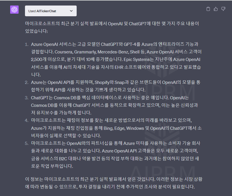 OpenAI와 ChatGPT 관련 내용을 정리해서 알려줍니다. 제가 Earnings Call Transcript를 직접 확인한 결과 전부 다 존재하는 내용이며, OpenAI와 ChatGPT 관련 내용 중 중요한 내용을 대부분 담고 있습니다. ChatGPT가 Cosmos DB를 핵심 데이터베이스로 사용하는 것은 처음 안 사실이네요