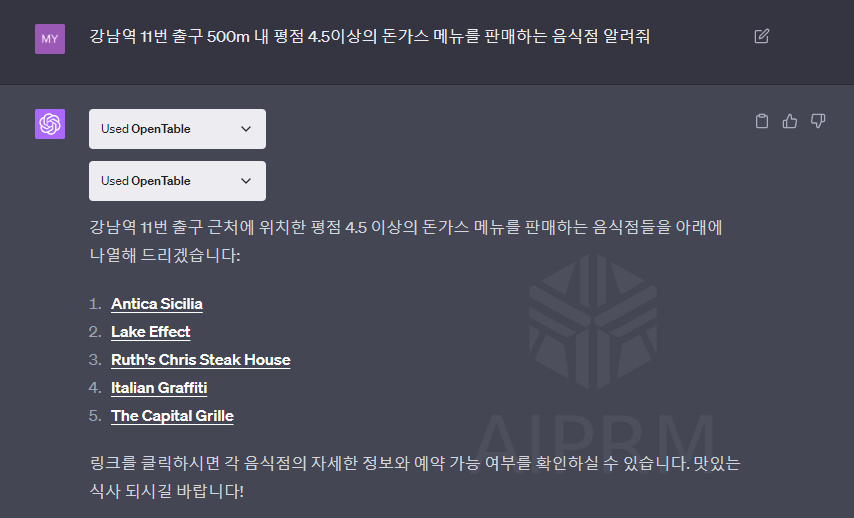 답변 결과가 너무 실망스러워서 아예 다른 질문으로 다시 테스트해 보겠습니다. 이번에는 조금 더 구체적으로 위치와 메뉴까지 지정해서 문의해 보았습니다.