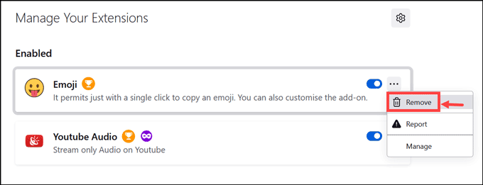 - Manage Your Extensions(확장 프로그램 관리)에서 세 개의 가로 점을 클릭하고 Remove(제거)를 선택합니다.