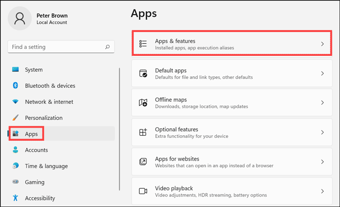 2. 왼쪽 창에서 Apps(앱)를 클릭한 다음 오른쪽 창에서 Apps & Features(앱 및 기능)를 선택합니다.