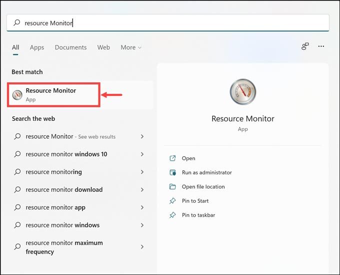 - Windows 11 검색 창에 Resource Monitor를 입력하고 해당 아이콘을 클릭합니다.