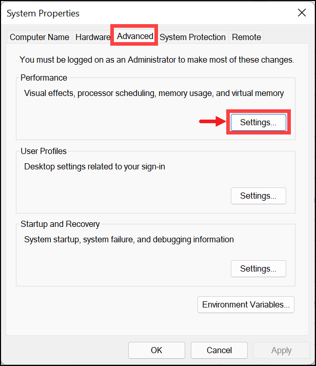 - Advanced(고급) 탭으로 전환하고 Performance(성능)에서 Settings(설정)를 클릭합니다.