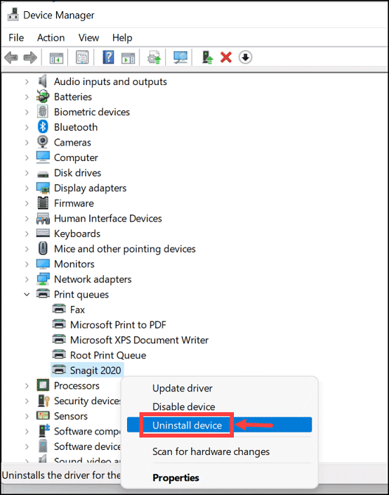 2. 드라이버를 마우스 오른쪽 버튼으로 클릭하고 상황에 맞는 메뉴에서 Uninstall device(장치 제거)를 선택합니다.