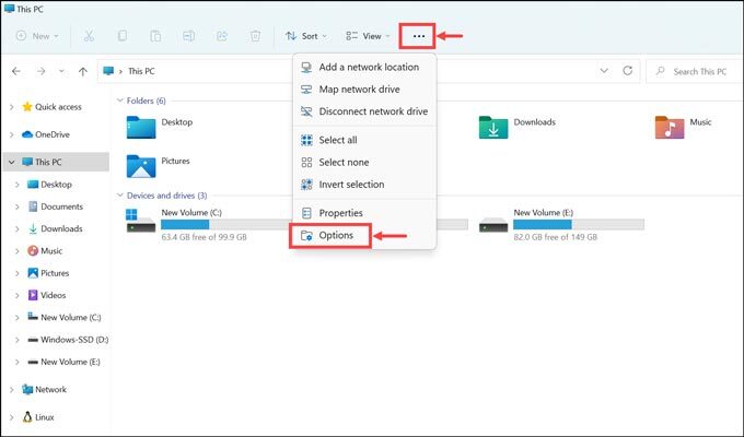 - 파일 탐색기 창에서 세 개의 점을 클릭하고 옵션을 선택합니다.