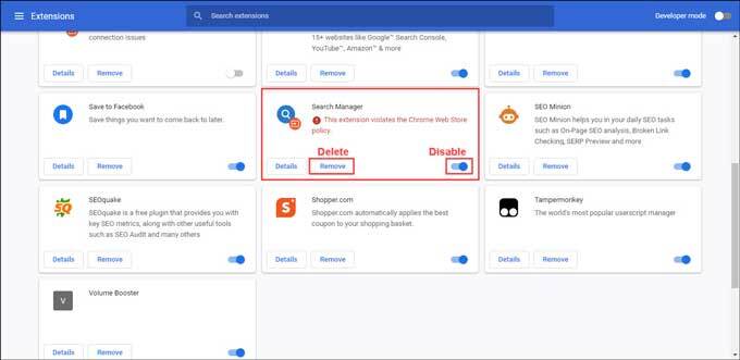 - Extensions 페이지에서 삭제하려는 확장 프로그램 아래에 있는 Remove 버튼을 클릭합니다.