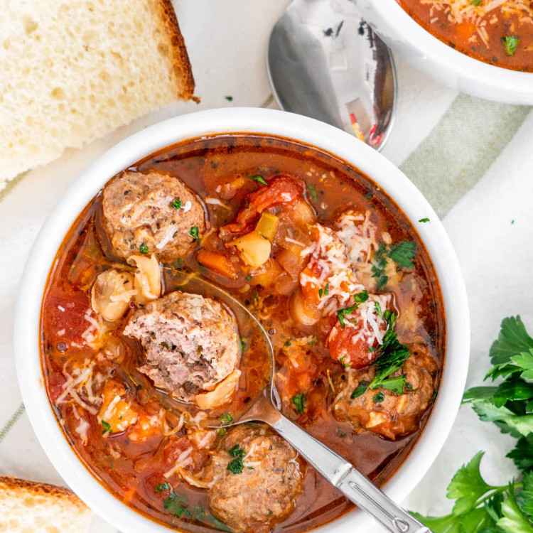 나는 이 수프에 들어가는 모든 작은 부분, 집에서 만든 미트볼, 야채, 콩, 이탈리아식 조미료를 좋아합니다 . 딱딱한 빵 한 덩어리 와 파마산 치즈를 듬뿍 곁들여 먹으면 세상이 즉시 더 친절하고 따뜻하며 부드러운 곳으로 느껴지는 것 같아요! 나는 수프의 품질을 좋아합니다. 매번 노력하는 것입니다!
