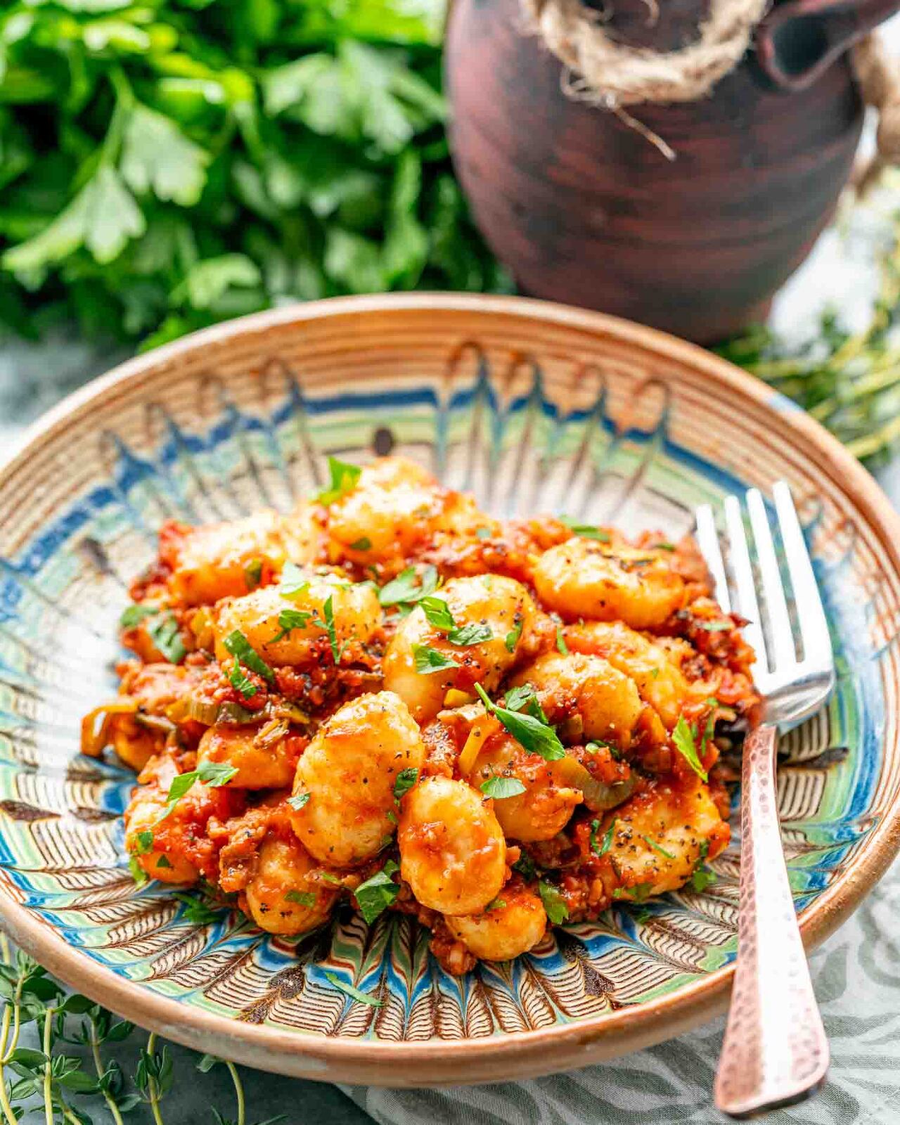 이 요리를 한 단계 더 발전시키고 싶다면 마음껏 뇨키를 직접 만들어보세요! 집에서 파스타를 만드는 것만큼 어렵지는 않지만 여전히 시간이 좀 더 필요합니다. 여기 처음부터 나만의 뇨키를 만드는 레시피가 있습니다.