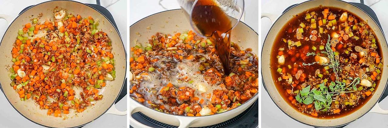 같은 냄비에 양파, 당근, 셀러리, 마늘을 넣고 약 3~4분간 또는 양파가 부드러워지고 마늘 향이 날 때까지 볶습니다.