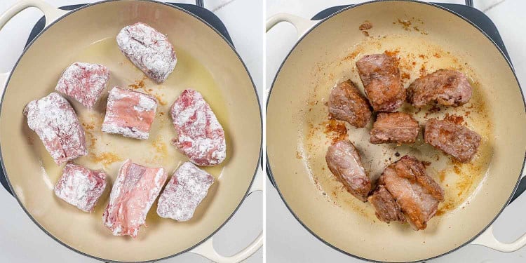대형 더치 오븐에서 올리브 오일을 중간 정도 높은 열로 가열합니다. 갈비뼈를 한 번에 절반만 추가하고 너무 많이 넣지 말고 갈색이 될 때까지 한 면당 약 3~4분씩 모든 면을 굽습니다. 남은 갈비뼈로 반복하십시오. 냄비에서 갈비뼈를 제거하고 따로 보관하십시오.