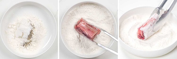 얕은 접시에 밀가루, 소금, 후추를 함께 섞습니다. 짧은 갈비뼈에 밀가루 혼합물을 묻혀 모든 면이 밀가루로 덮이도록 합니다.