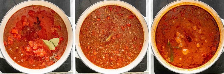 먼저 대형 더치 오븐에 올리브 오일을 넣고 중간 불로 가열하세요. 기름이 뜨거워지면 다진 쇠고기, 소금, 후추를 넣습니다. 이것을 약 3-4분 동안 요리하고, 요리하는 동안 쇠고기를 더 작은 조각으로 나눕니다. 팬에 기름이 많이 묻어 있으면 대부분 버려도 되지만 풍미를 위해 1~2큰술 정도 남겨두세요.