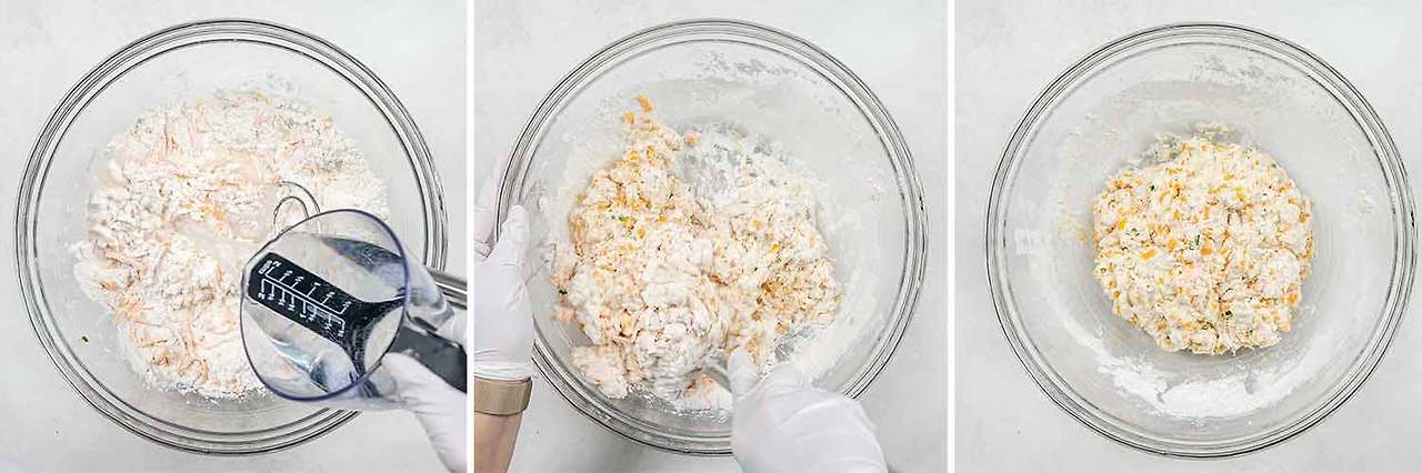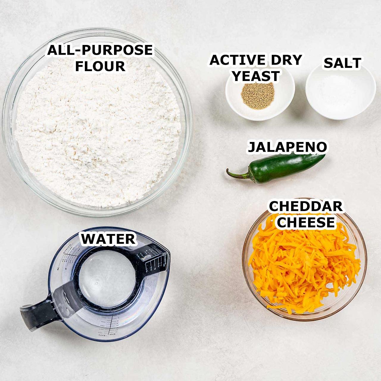 시작하려면 밀가루, 소금, 이스트, 체다 치즈, 잘게 썬 할라피뇨를 큰 그릇에 함께 섞으세요.