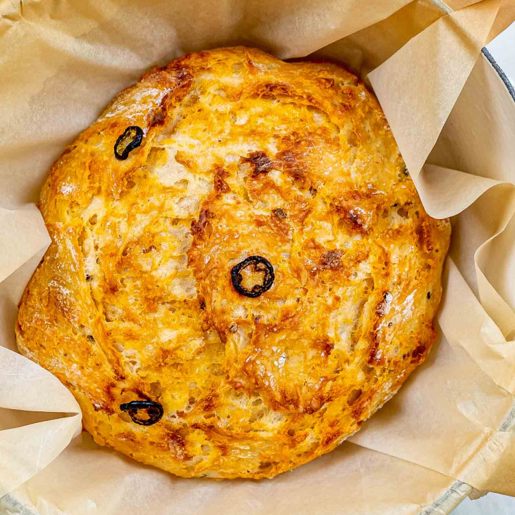 이 정말 치즈 맛이 나고 반죽이 필요 없는 매콤한 빵 레시피를 이보다 더 쉽게 만들 수는 없습니다! 반죽을 큰 그릇에 넣고 잘 저어준 뒤, 뜨거운 더치 오븐에 넣고 굽기만 하면 됩니다!