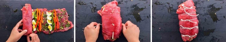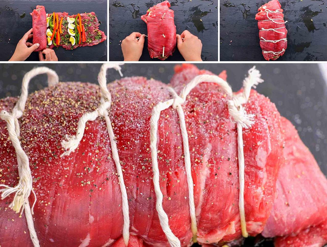 충전물 위에 고기를 조심스럽게 말아 올려서 왼쪽에서 오른쪽으로 결을 가로질러 젤리 롤 스타일로 만들었습니다. 정육점 노끈으로 묶어서 고정하세요. 롤의 바깥쪽에 소금과 후추를 넉넉하게 양념합니다.