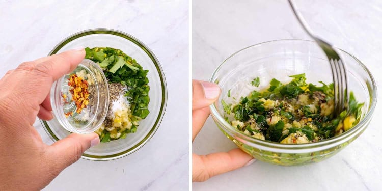 작은 그릇에 올리브 오일, 고수, 파슬리, 마늘, 소금, 후추, 고추 플레이크를 함께 섞습니다.