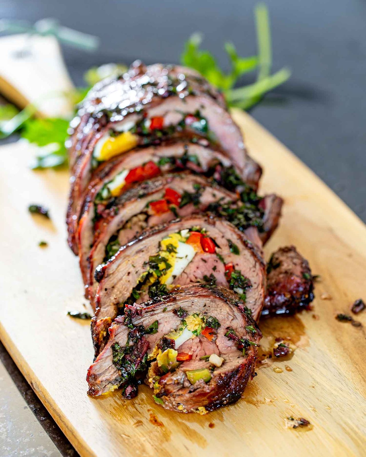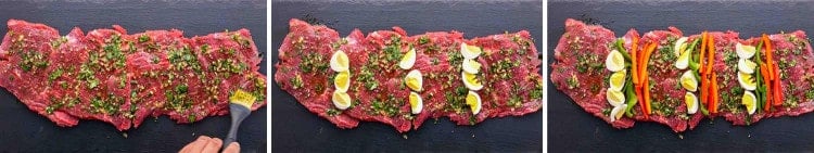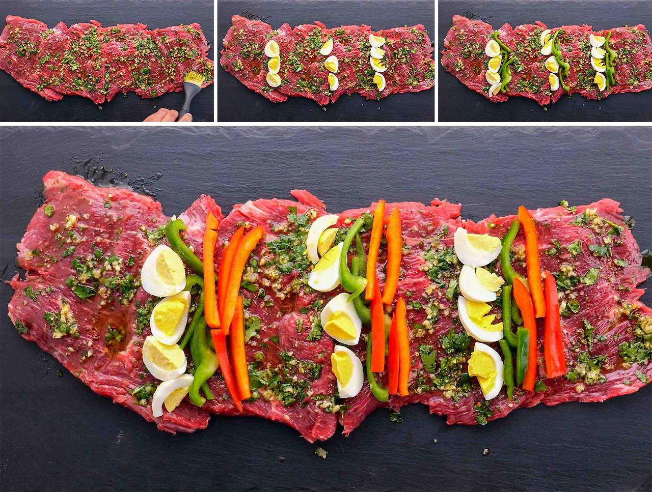 이제 재미있는 부분이 시작됩니다. 치미추리 혼합물을 옆구리 스테이크 위에 펴 바르고 스테이크 표면 전체에 고르게 발라줍니다. 4등분한 계란을 옆구리 스테이크에 서로 다른 간격으로 3줄로 배열합니다. 얇게 썬 고추로 반복하십시오.