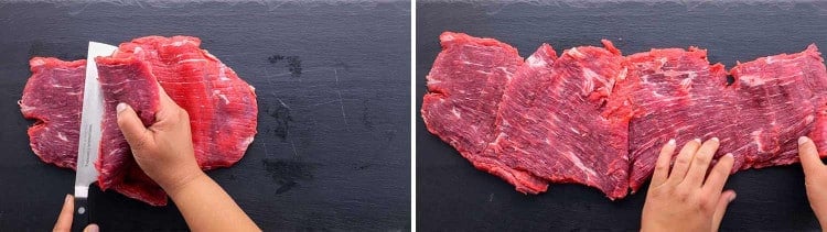 첫 번째 단계는 옆구리 스테이크를 준비하는 것입니다. 날카로운 칼을 사용하여 슬라이스하고 책처럼 펼칩니다( 옆구리 스테이크를 접는 방법은 아래 지침 참조 ). 고기를 더 얇게 만들고 싶다면 망치로 두드려서 납작하게 펴고 두께를 균일하게 하시면 됩니다.