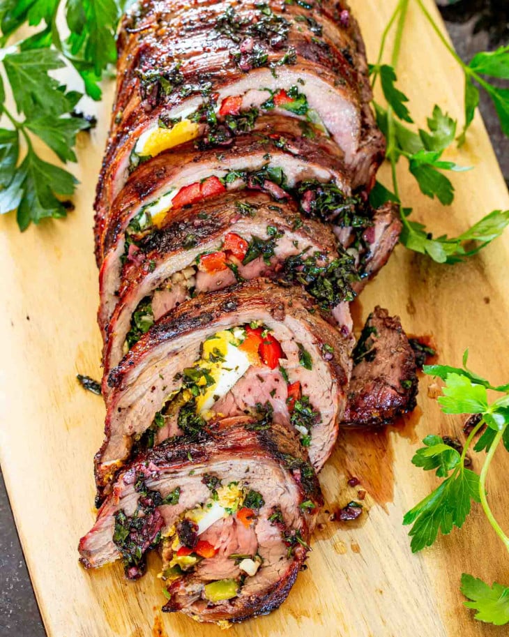 이 마탐브레(Matambre) 는 삶은 달걀, 피망, 고수풀, 마늘, 올리브 오일을 섞은 아르헨티나산 속을 채운 측면 스테이크 입니다 . 그런 다음 마탐브레를 완벽하게 구워서 얇게 썰어서 먹습니다.