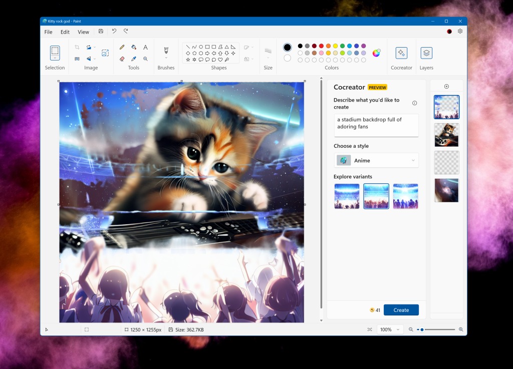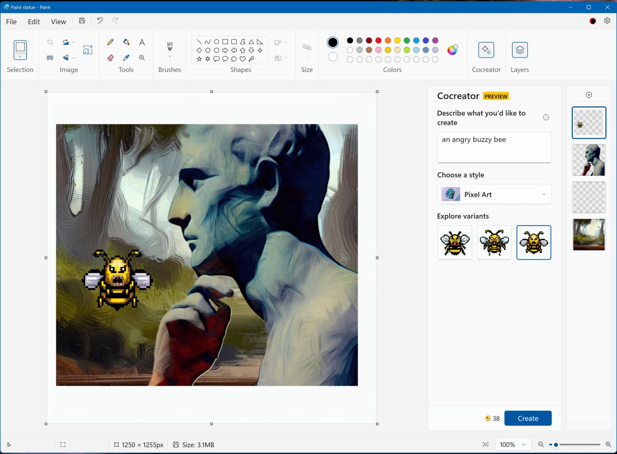 2019년 그림판의 수명이 연장됐으며, 그 이후 마이크로소프트는 결국 그림판을 다시 부활시켰다. 2019년에 접근성 개선 기능이 추가된 이후로 그림판은 부흥기를 맞이하며 배경 제거, 투명도 및 레이어, 빙 이미지 크리에이터(Bing Image Creator)를 사용하는 AI 아트 도구인 코크리에이터(Cocreator)가 추가됐다. ⓒ Foundry 그림판의 핵심은 여전히 그림이다. 크기를 변경하고 그림을 그리며 화살표를 추가하고 이미지 전반을 교정하는 기본적인 도구이다. 하지만 3가 최신 기능은 포토샵과 유사하다. 사진을 촬영하고 AI를 사용해 사진 속 대상을 선택하고 가져오며, AI 배경을 추가하고 새로운 예술 작품을 다시 만들 수 있다. 포토샵을 사용해 본 적 없는 사람에게는 직관적이지 않을 수 있지만, 간단한 기능이다. ⓒ Foundry 그림판의 기조는 여전히 간결성이다. 윈도우 11 2023 업데이트는 생성형 AI 아트의 이점을 몇 가지 가져와 그림판에 적용한다. 개선의 여지는 있지만 흥미로운 추가 기능이다.