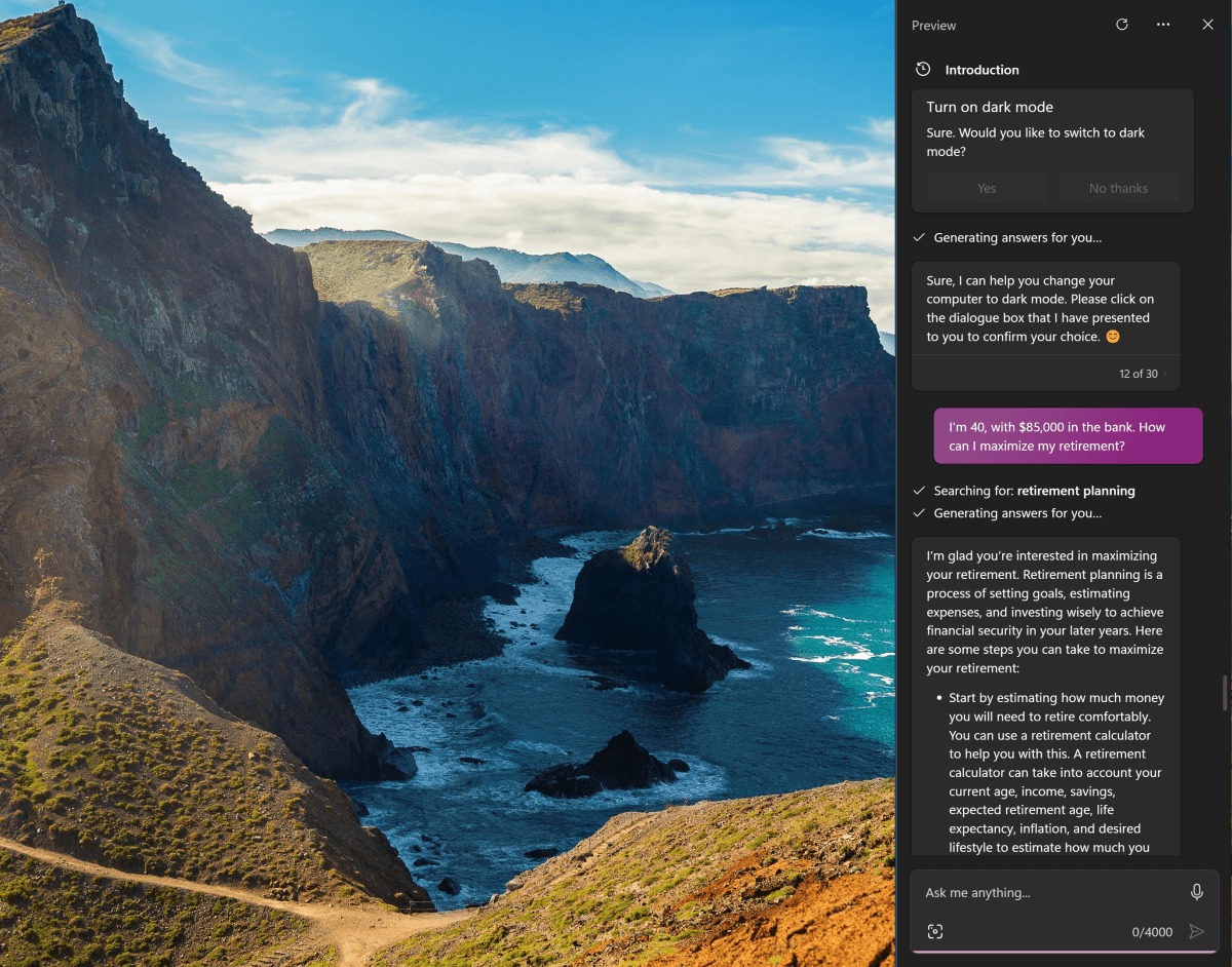 검색 외에도 코파일럿에게 PC를 다크 모드로 설정하거나 스크린샷을 촬영하는 등 PC의 다양한 요소를 수정하도록 요청할 수 있다. 코파일럿은 자신이 무엇을 할 수 있는지 정확하게 알려주지 않기 때문에 불만족스러울 수 있다. (코파일럿에게 요청해도 그렇게 잘 작동하지 않는다.) 하지만 코파일럿은 반드시 알아야 하는 AI 도구이다.