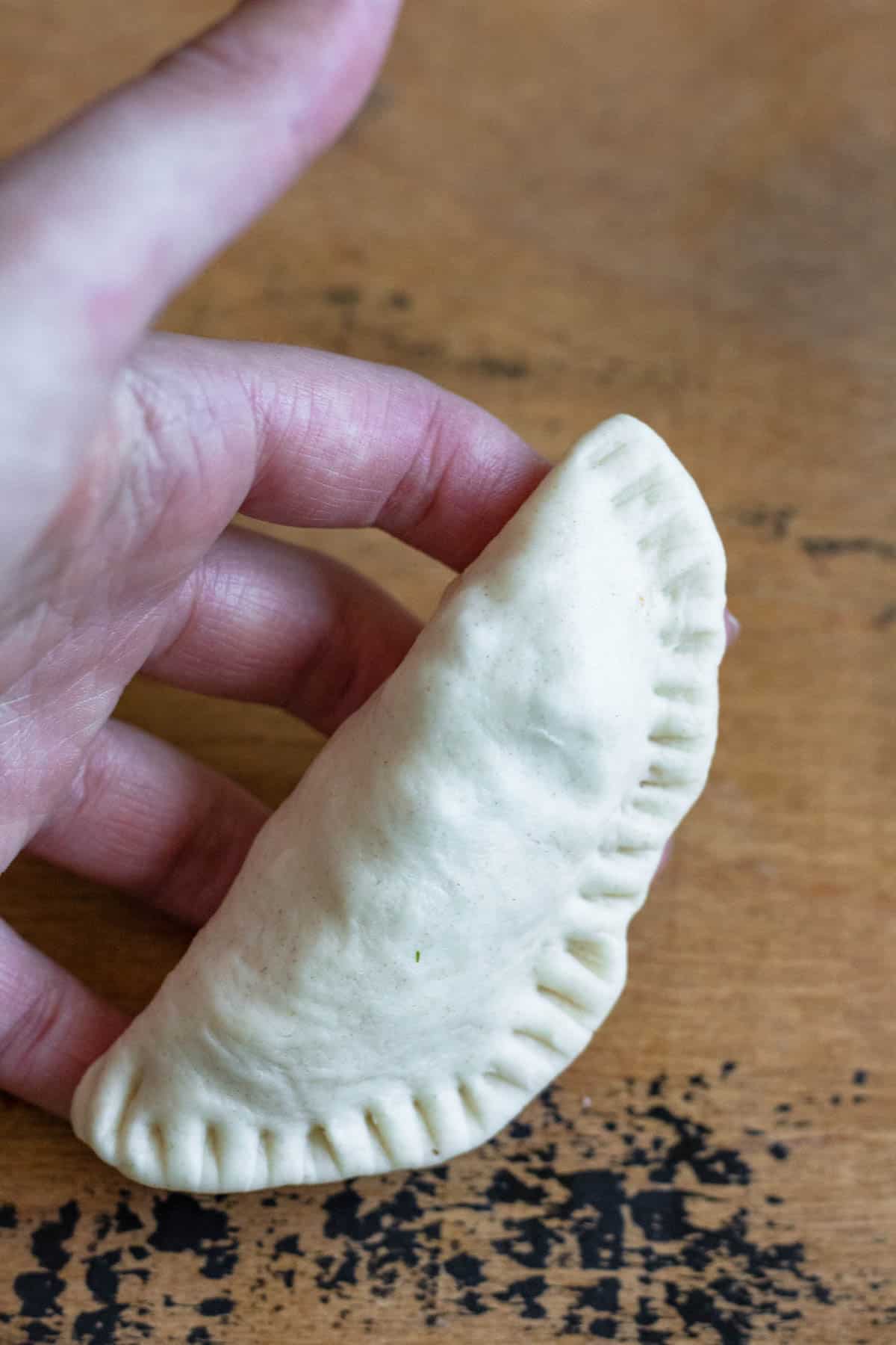 반죽의 가장자리를 꼬집으면 요리하는 동안 충전재가 안에 단단히 고정되는 데 도움이 됩니다. 포크 끝으로 아주 간단하게 가장자리를 집거나 더 멋진 땋기 또는 리펄그 기술을 사용할 수 있습니다 . 어느 쪽이든 괜찮지만 손님에게 깊은 인상을 주고 싶다면 말이죠. 리펄그 기술을 시도해 보세요.