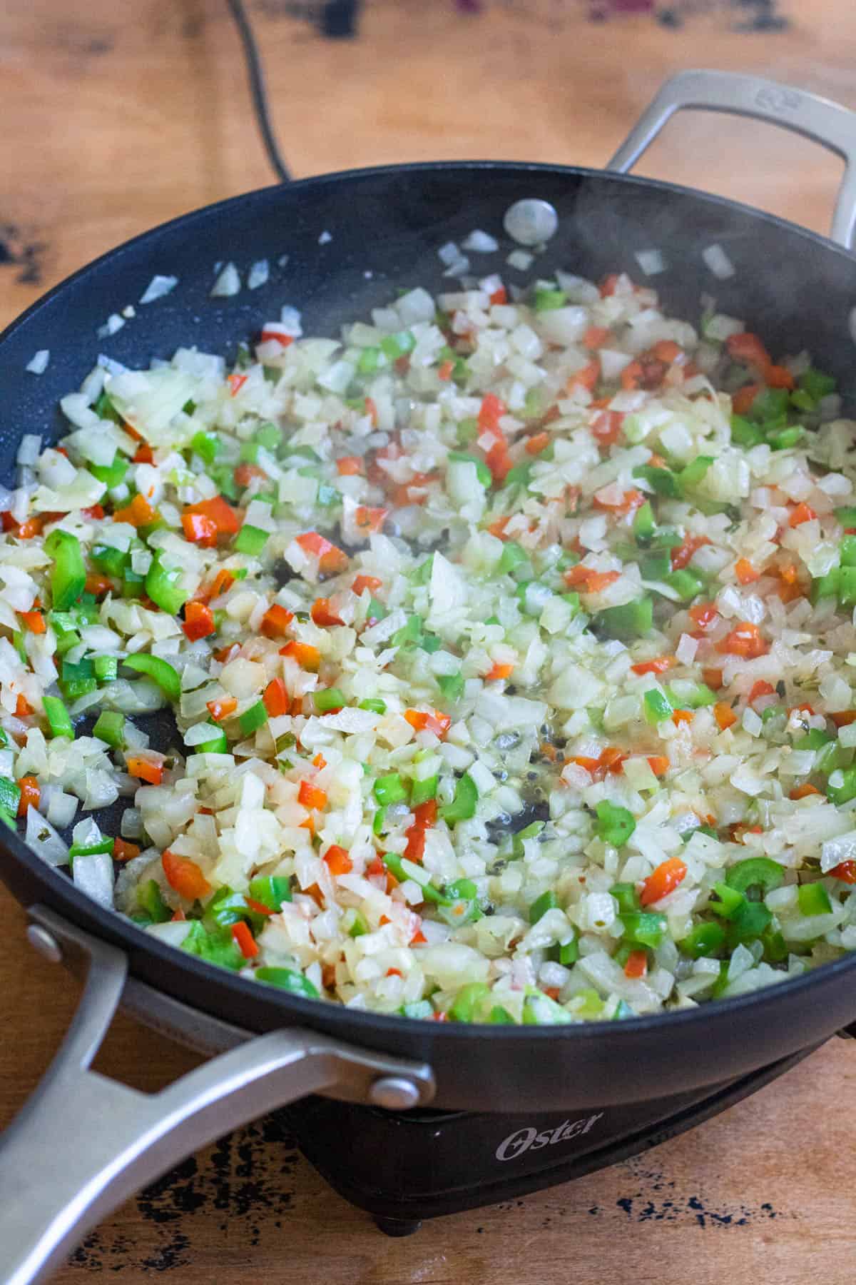 큰 팬에 오일을 넣고 따뜻해질 때까지 약한 불로 가열합니다. 그런 다음 양파, 붉은 고추, 피망을 추가합니다. 반 정도 부드러워질 때까지 몇 분간 볶습니다.