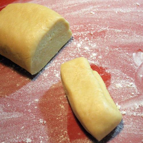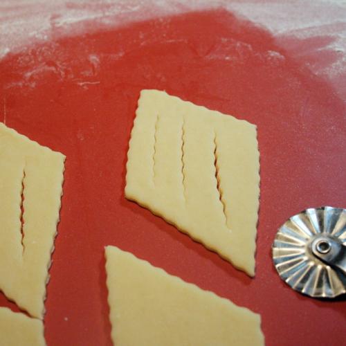 시간은 더 걸리지만 꼭 필요합니다. 반죽을 펴서 여러 번 접어야 합니다. 그런 다음 전자레인지 봉지에 넣고 냉장고에 최소 1시간 동안 넣어둡니다. 우리는 반죽을 꺼낼 때 항상 한 조각만 잘라서 밀가루를 살짝 뿌린 표면에 거의 국수처럼 아주 얇게 펴줍니다. 자를 이용해 마름모 모양으로 자르고 가운데에 틈을 만들어주세요. 하지만 우리가 원하는 대로 다른 끈으로 다른 모양을 만들 수도 있습니다. 우리는 나머지 여행을 계속합니다.