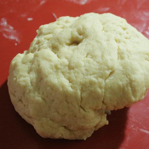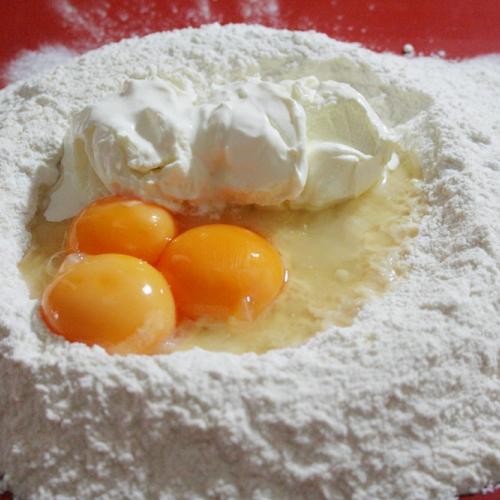 자, 여기 갑니다. 우리는 매트에 밀가루를 붓고 우물을 만들고 그 안에 반죽의 모든 재료를 넣은 다음 먼저 칼로 반죽을 가장자리에서 중앙까지 작업하기 시작합니다. 묽다면 밀가루를 넣어주세요. 그런 다음 손으로 반죽을 반죽합니다. 처음에는 보기에 좋지 않지만 반죽을 철저히 작업하여 윤기가 나도록 해야 합니다.