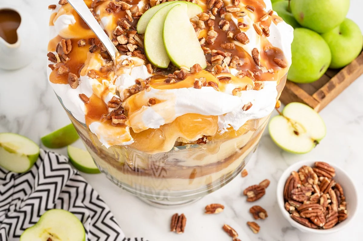 우리의 쉬운 Caramel Apple Trifle 레시피는 제가 가장 좋아하는 가을 맛 조합으로 가득 차 있습니다. 내 시나몬 롤 애플 파이 컵, 애플 파이 타코 , 애플 파이 쿠키 와 마찬가지로 이 사과 캐러멜 사소한 일도 전통적인 사과 파이의 맛있는 맛을 모두 가져와 캐러멜 사과 디저트로 바꿔줍니다.