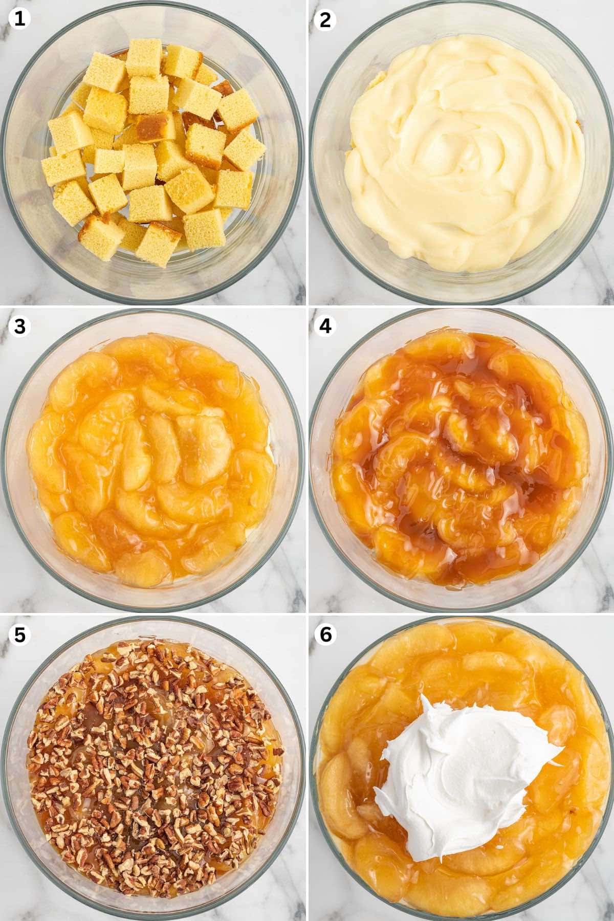 - 조립: 트라이플 그릇의 바닥에 큐브 케이크 층을 깔고 그 위에 푸딩 혼합물을 펴고 사과 파이 필링으로 덮고 캐러멜 소스를 뿌린 다음 피칸을 뿌립니다. 파운드 케이크, 푸딩, 사과 파이 채우기 레이어를 반복합니다.