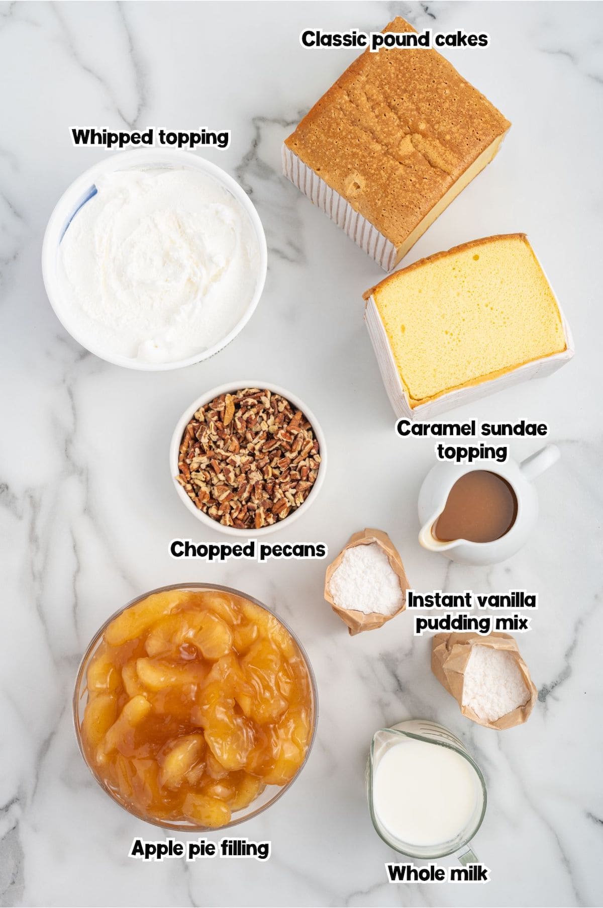 이 캐러멜 애플 트라이플은 미리 만들어진 파운드 케이크, 인스턴트 푸딩, 사과 파이 필링, 캐러멜 소스, 피칸을 겹겹이 쌓아 편리하게 준비한 다음 Cool Whip 용기를 얹기 때문에 이보다 더 쉽게 만들 수 없습니다. 완벽한 가을 디저트 !