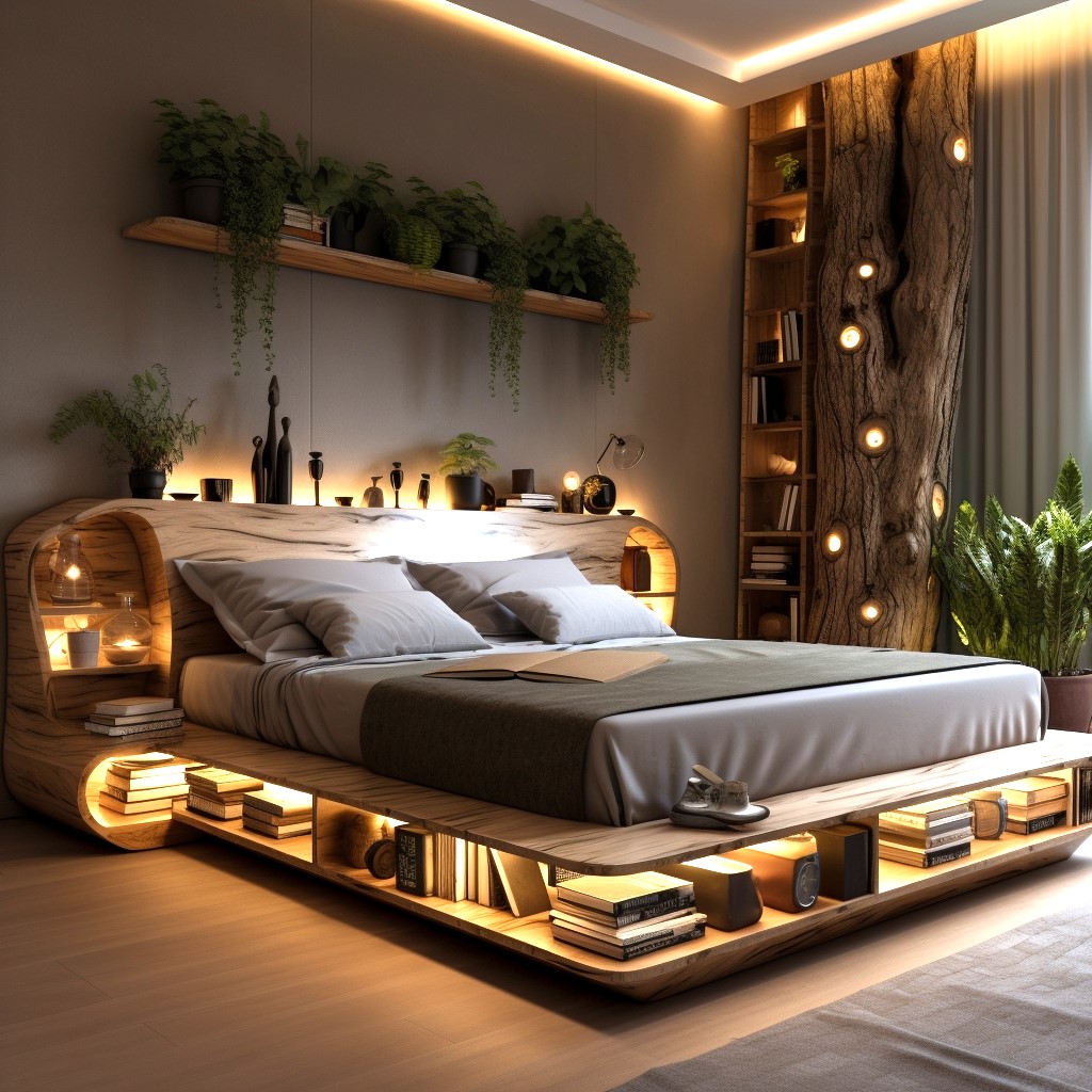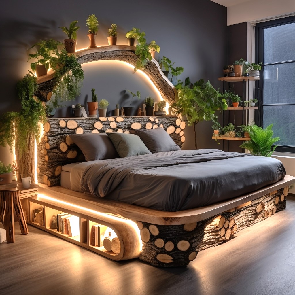 나무 모양의 침대 책장은 통나무의 세심한 배열을 통해 나무의 가지 구조를 모방한 것이 특징입니다. 각 통나무는 선반 역할을 하며 자연의 유기적인 형태를 모방한 시각적으로 매혹적인 머리판을 만듭니다. 이 디자인은 책과 침대 옆 필수품을 위한 넉넉한 수납 공간을 제공할 뿐만 아니라 침실에 숲속의 기발한 느낌을 더해줍니다. 주택 소유자는 통나무의 차분하고 자연스러운 미학을 침실 공간에 불어넣어 침대를 숲속의 안식처를 연상시키는 아늑한 휴양지로 바꿀 수 있는 기회를 받아들였습니다.