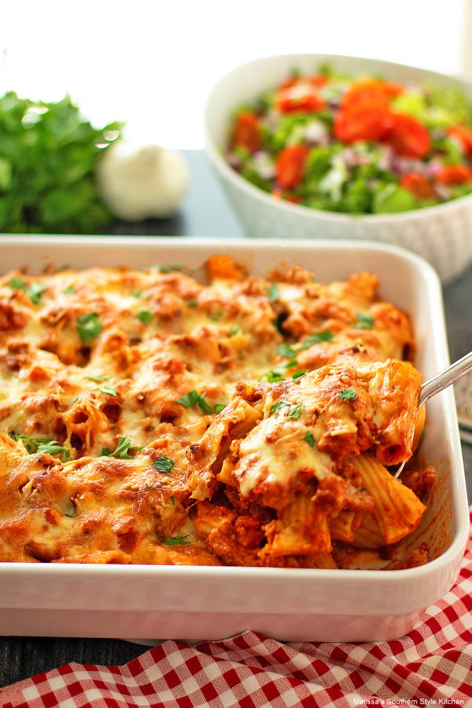 - 캐서롤 조립 – 리가토니의 절반을 준비된 접시에 붓습니다. 잘게 썬 모짜렐라 치즈 1 1/2컵을 뿌립니다.