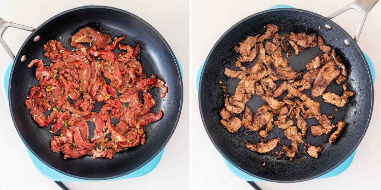 - 요리하는 동안 쇠고기가 너무 많이 익지 않도록 주의하고, 고기가 완전히 익을 때까지 시간을 갖고 2~3번에 걸쳐 요리하세요.