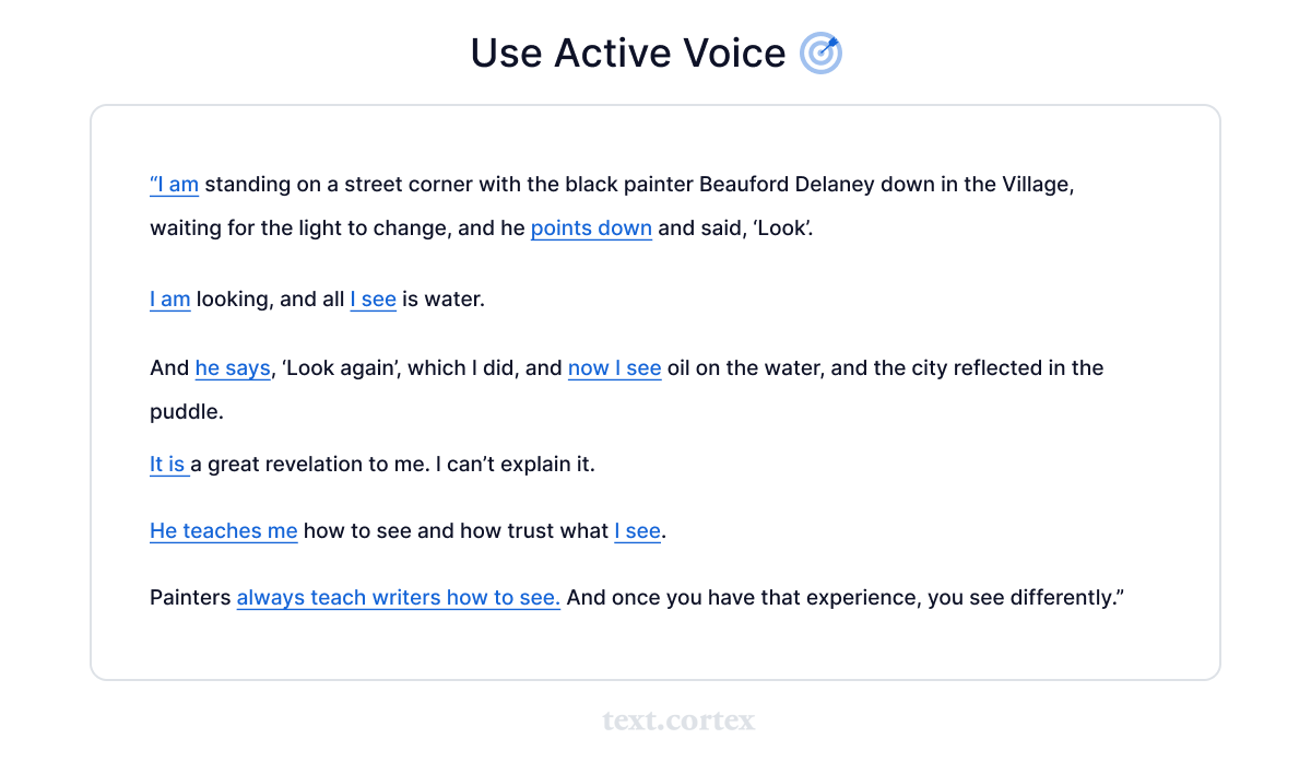 문장을 능동태로 작성하고 단순 시제를 사용하면 콘텐츠가 더 설득력 있게 들리고 독자가 메시지를 쉽게 이해할 수 있습니다.