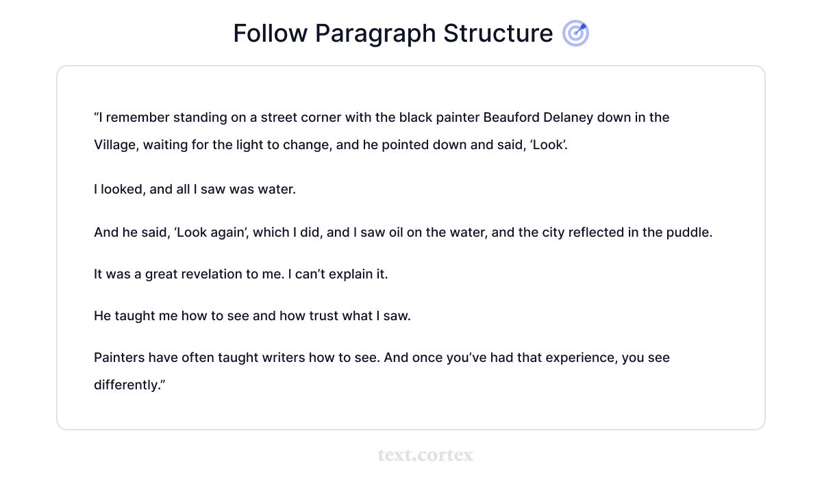 이 글에서 각 단계의 예로 사용할 제임스 볼드윈의 다음 단락에서 이를 확인해 보겠습니다.