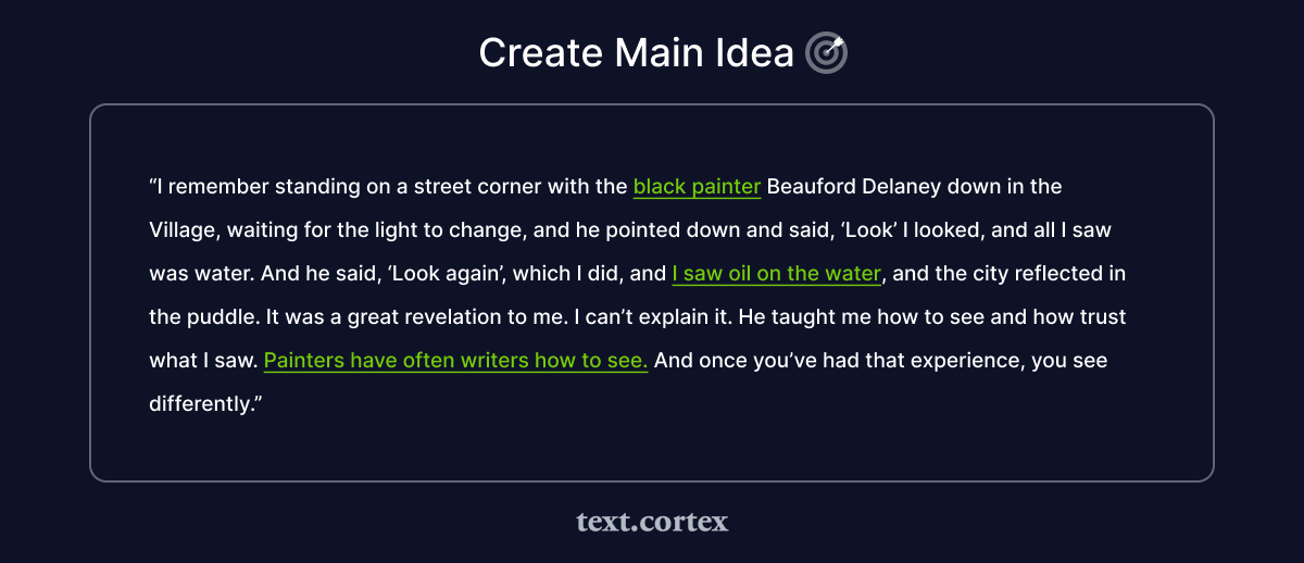이 예의 주요 아이디어는 화가가 종종 작가에게 보는 방법을 가르치고, 그 발표 전후의 모든 것이 그 주요 아이디어를 이끌고 정당화한다는 것입니다.