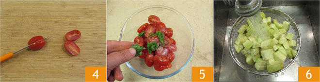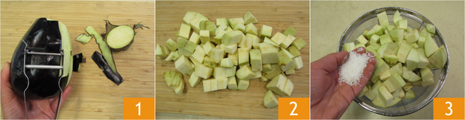 콜드 파스타 알라 노르마를 준비하려면 야채 필러로 가지 껍질을 벗겨주세요. 1(껍질을 버리지 마십시오. 원하는 경우 잘게 썰어서 튀겨서 요리 장식에 사용할 수 있습니다.) 그런 다음 주사위를 굴립니다. 2. 가지에 소금을 뿌리고 소쿠리에 담아 물기를 빼내고 쓴맛을 제거합니다 .3. 그 동안 방울토마토를 씻어서 반으로 잘라주세요