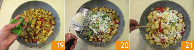 바질 잎으로 저어 맛을 낸다 19. 소금에 절인 리코타 치즈의 작은 강판 조각으로 양념을 하세요. 20그리고 또 한 방울의 기름. 서빙하기 전에 완전히 저어주고 5분 동안 그대로 두십시오. 차가운 파스타 alla Norma를 즐길 준비가 되었습니다.