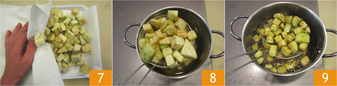 7. 약간의 기름을 338-356°로 가열하고 가지를 몇 분간 볶습니다. 8. 황금색일 때 배수 9. 흡수지가 깔린 트레이에 올려 여분의 기름을 제거하세요