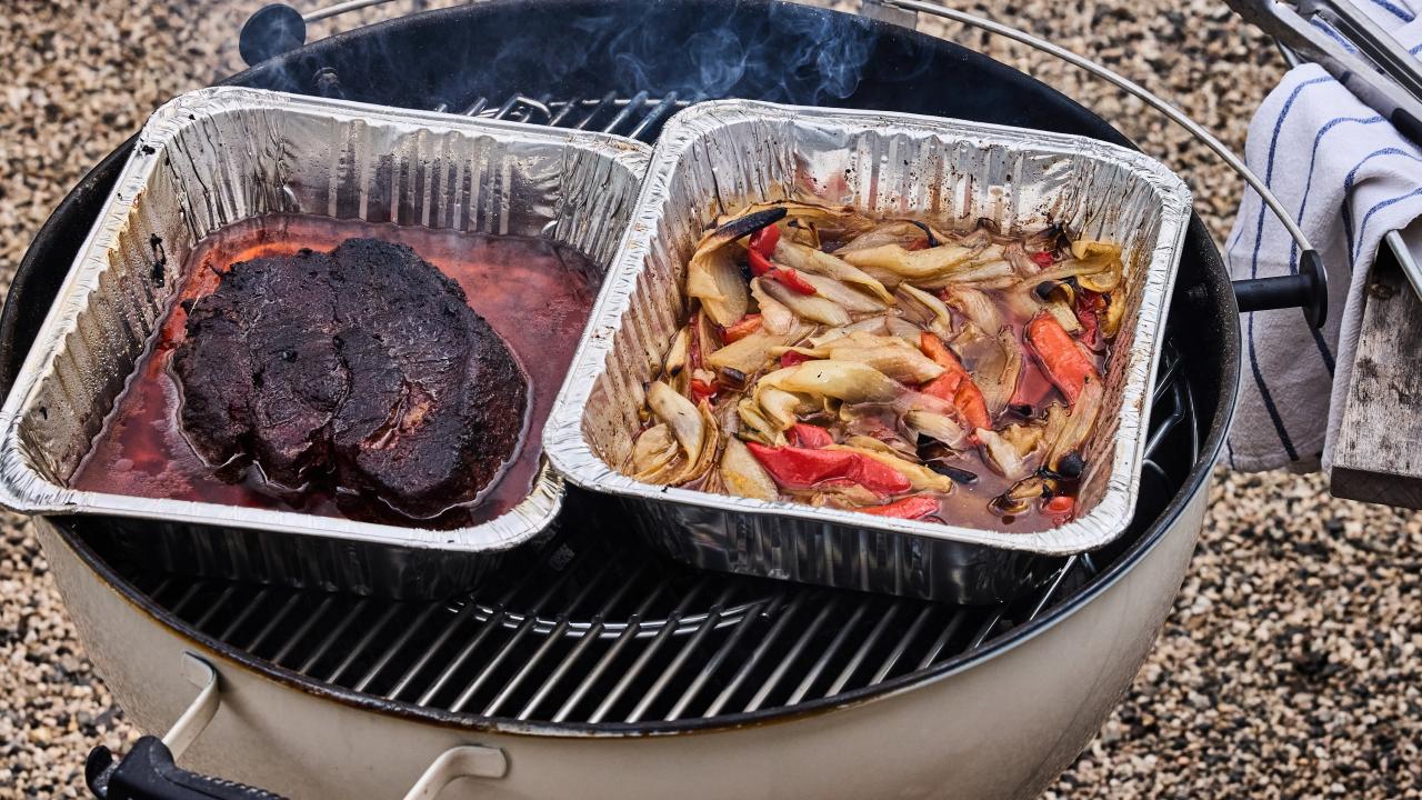 - 또 다른 8x10인치 일회용 알루미늄 팬이나 기타 그릴용 팬에 남은 2컵의 스톡을 채웁니다. 고기가 화씨 165도에 도달하면 재빨리 용기에 넣고 윗부분을 호일로 단단히 감쌉니다. 그릴 온도를 화씨 250도까지 올릴 만큼 충분한 석탄을 추가하고 석탄 반대쪽에 있는 주석에 고기를 넣으세요. 석탄 위에 고추와 양파를 놓습니다. 온도를 화씨 250도로 유지하기 위해 더 이상 칩이나 석탄을 추가할 필요가 없습니다. 고기가 화씨 200~203도에 도달할 때까지 계속 요리하세요. 고기는 아주 부드러워서 칼을 꽂아도 저항이 거의 없어야 합니다. 소요 시간은 개인마다 다르지만 3~4시간 정도 더 걸릴 수 있습니다. 고기를 확인할 때마다 주석을 잘 다시 포장하십시오. 석탄을 추가할 때 고추와 양파를 저어주고 매우 부드러워질 때까지 요리하세요. 타기 시작하면 약간의 육수를 추가하세요. 고기를 먹기 전에 고추와 양파를 먼저 볶을 수도 있습니다.