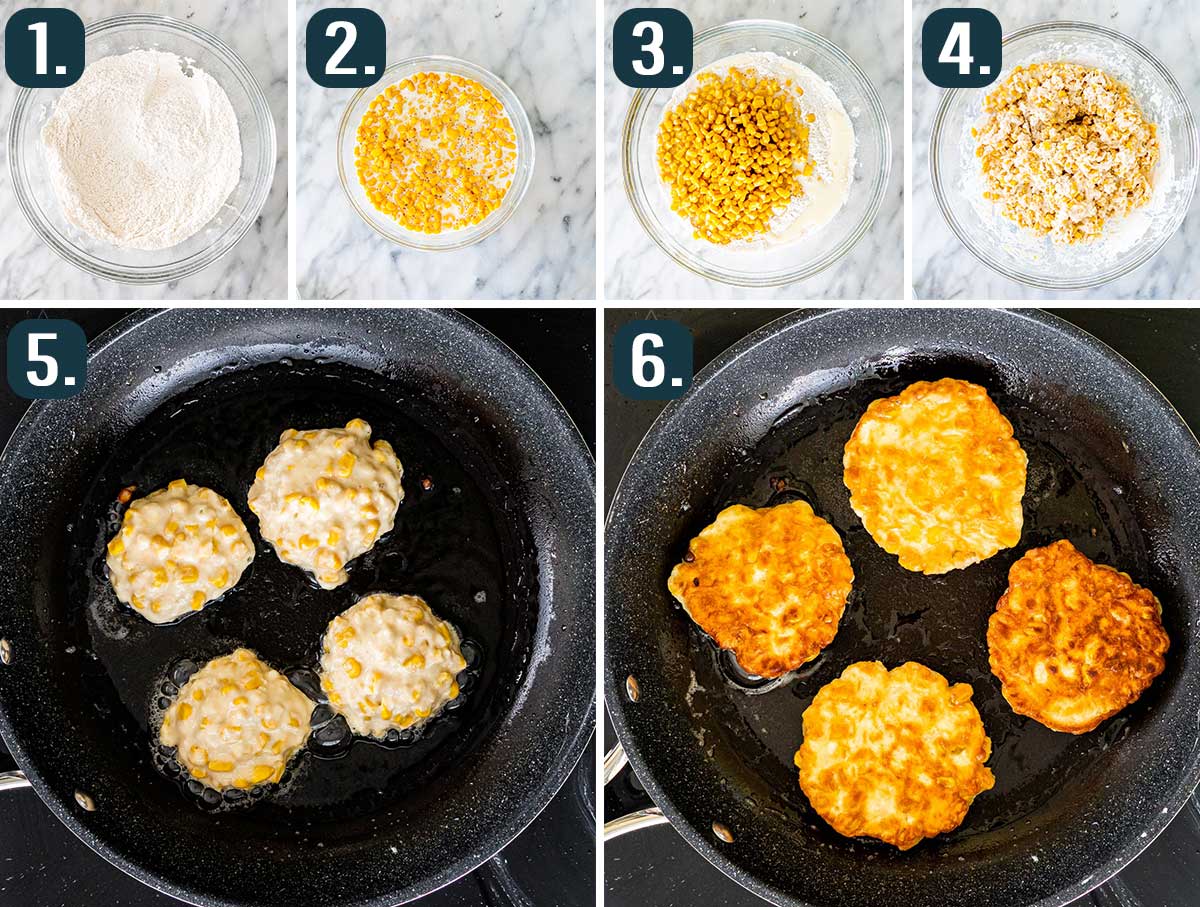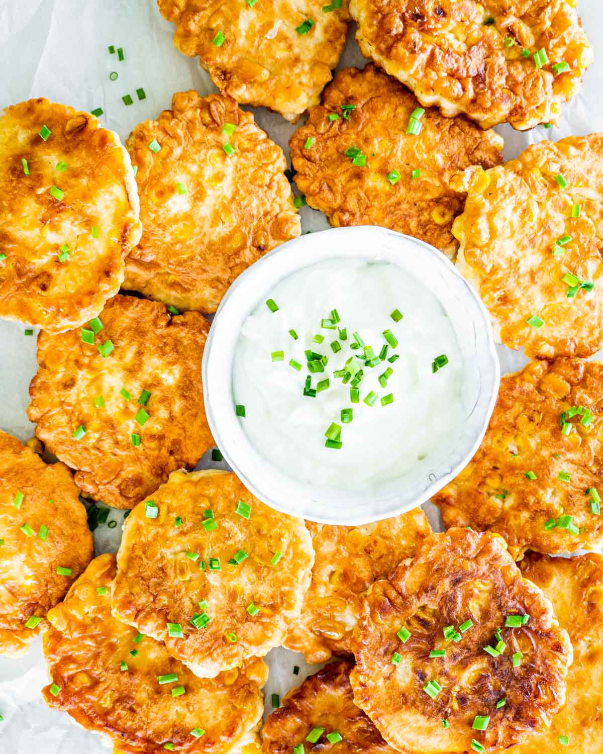 반찬이고, 파티 전채이고, 브런치입니다. 옥수수튀김 이에요 ! 한입 먹을 때마다 신선한 옥수수알이 터져 나옵니다. 겉은 바삭하고 안은 따뜻하고 부드러운 이 튀김은 누구의 얼굴에도 미소를 짓게 합니다.