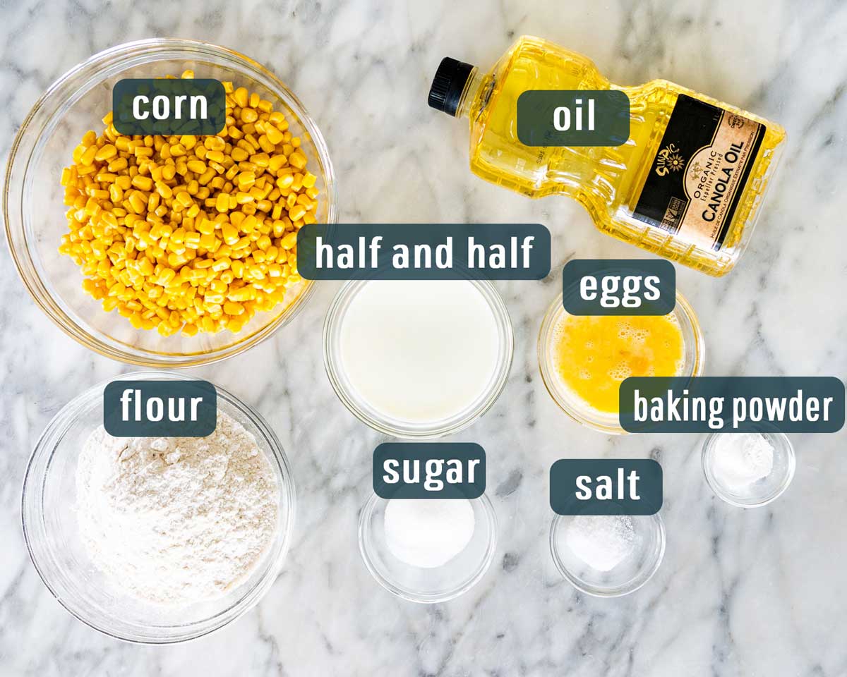 - 건조 재료: 큰 그릇에 밀가루, 설탕, 소금, 베이킹 파우더를 함께 섞습니다. 옥수수를 넣고 저어 밀가루 혼합물을 입힙니다.